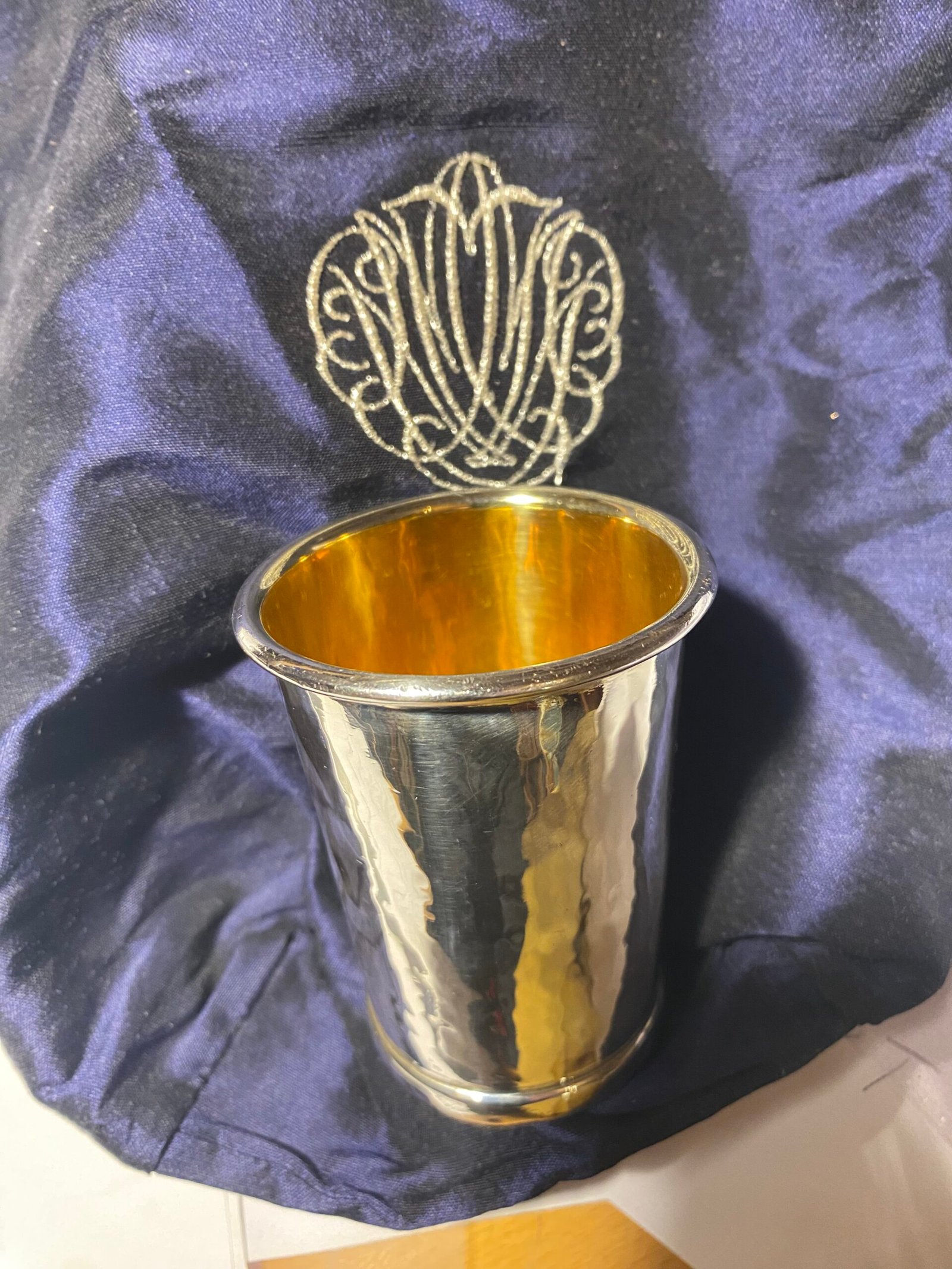 Hamret bæger i 958 Brittannia sølv med holdigheds- og mesterstempel. Indvændigt forgyldt.