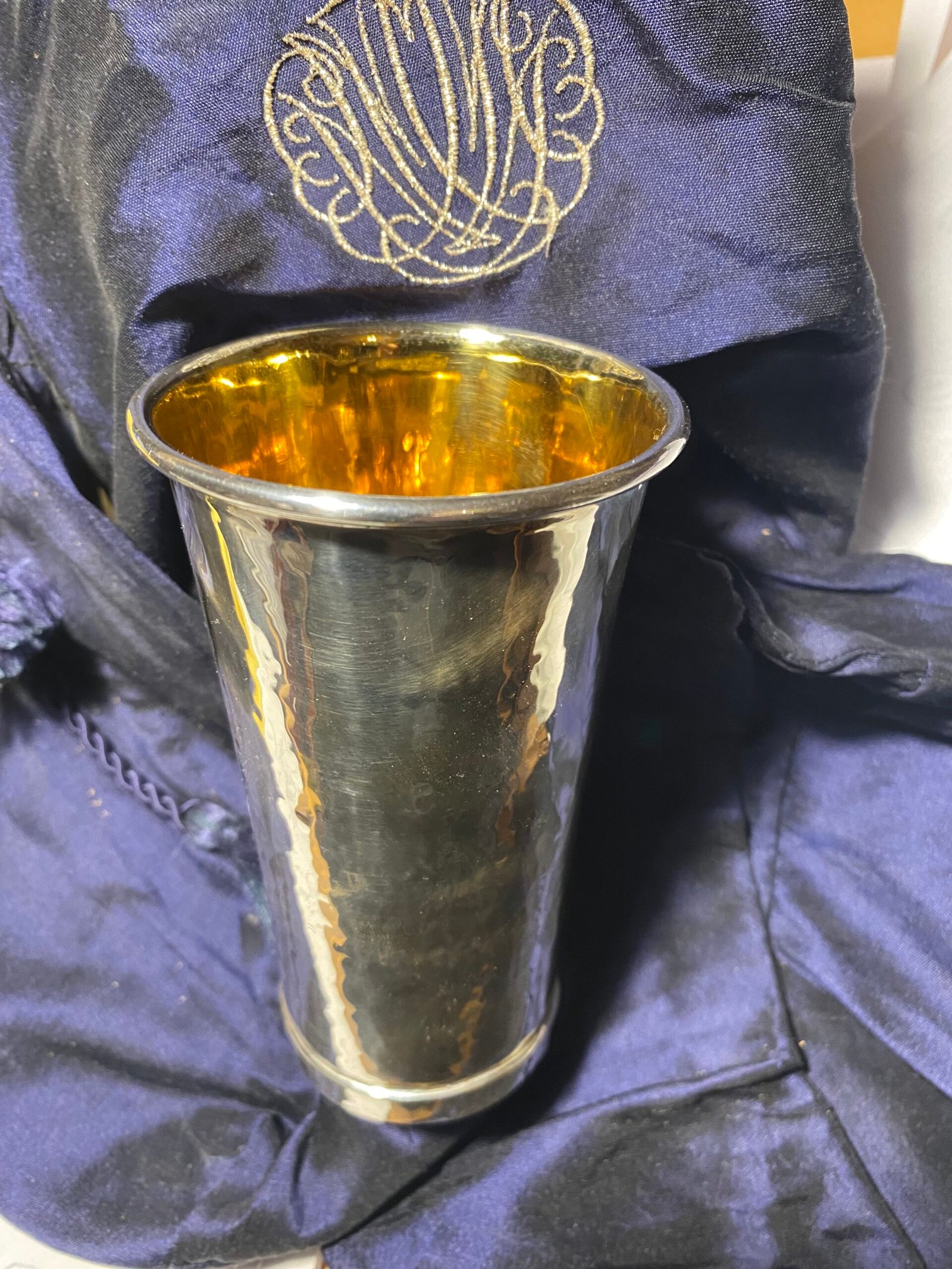 Hamret bæger i 958 Brittannia sølv med holdigheds- og mesterstempel. Indvændigt forgyldt.